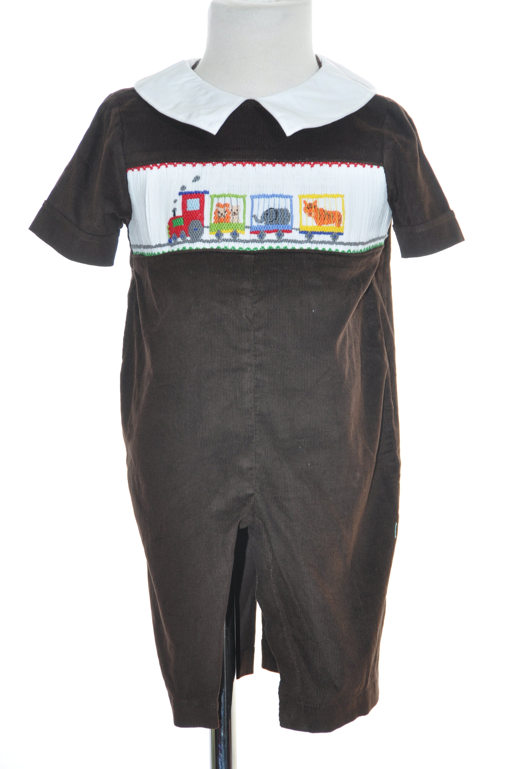 This Brown Corduroy Animal Train Smocked Boy Romper combines cozy corduroy fabric with charming animal and train details for a playful look.  Perfect for everyday adventures, this romper offers warmth and easy dressing, making it a practical and adorable addition to your baby's wardrobe.
