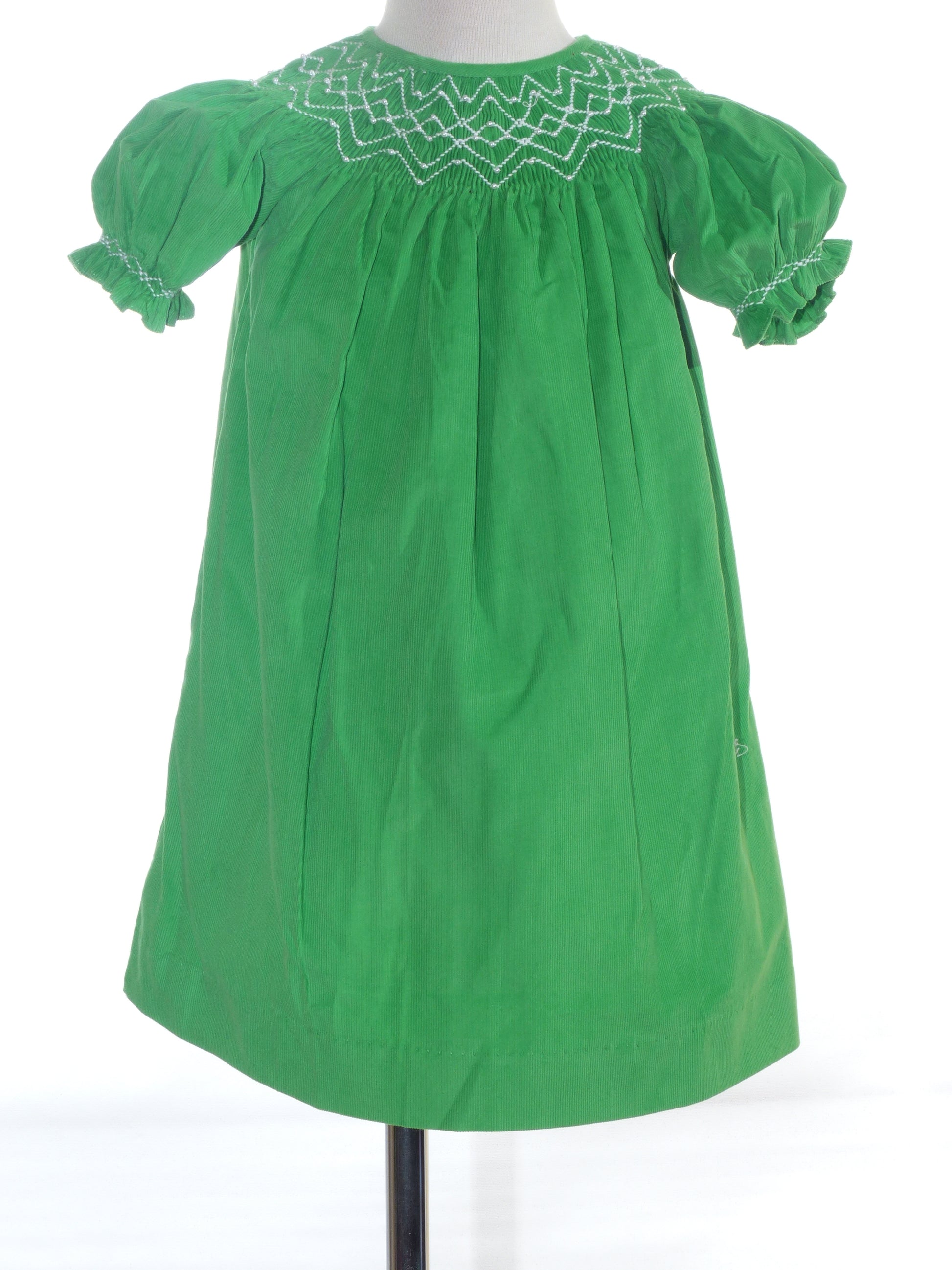 This green corduroy dress features sweet white pearl smocking and classic bishop sleeves.  Get into the holiday spirit with this festive outfit!
