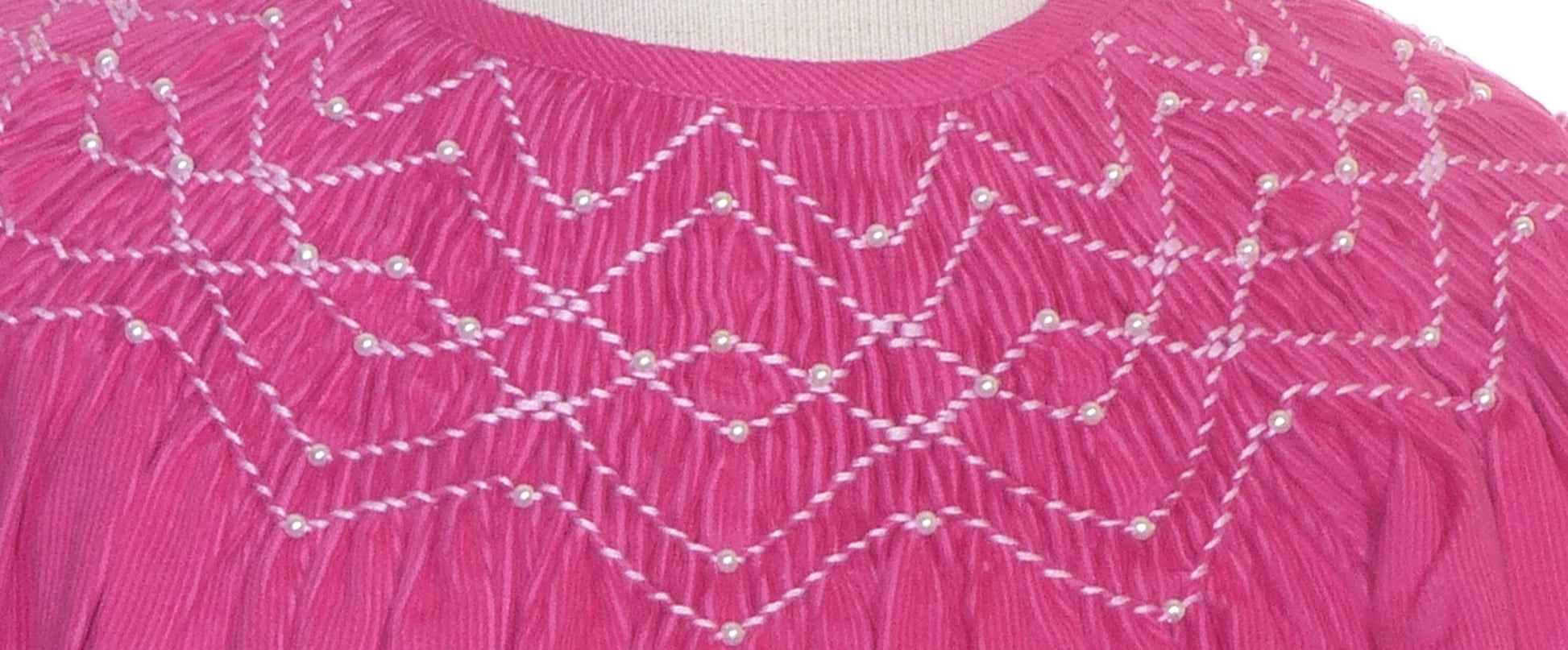 Hot Pink Corduroy Geo Smocked With Pearls Long Sleeve Bishop Dress