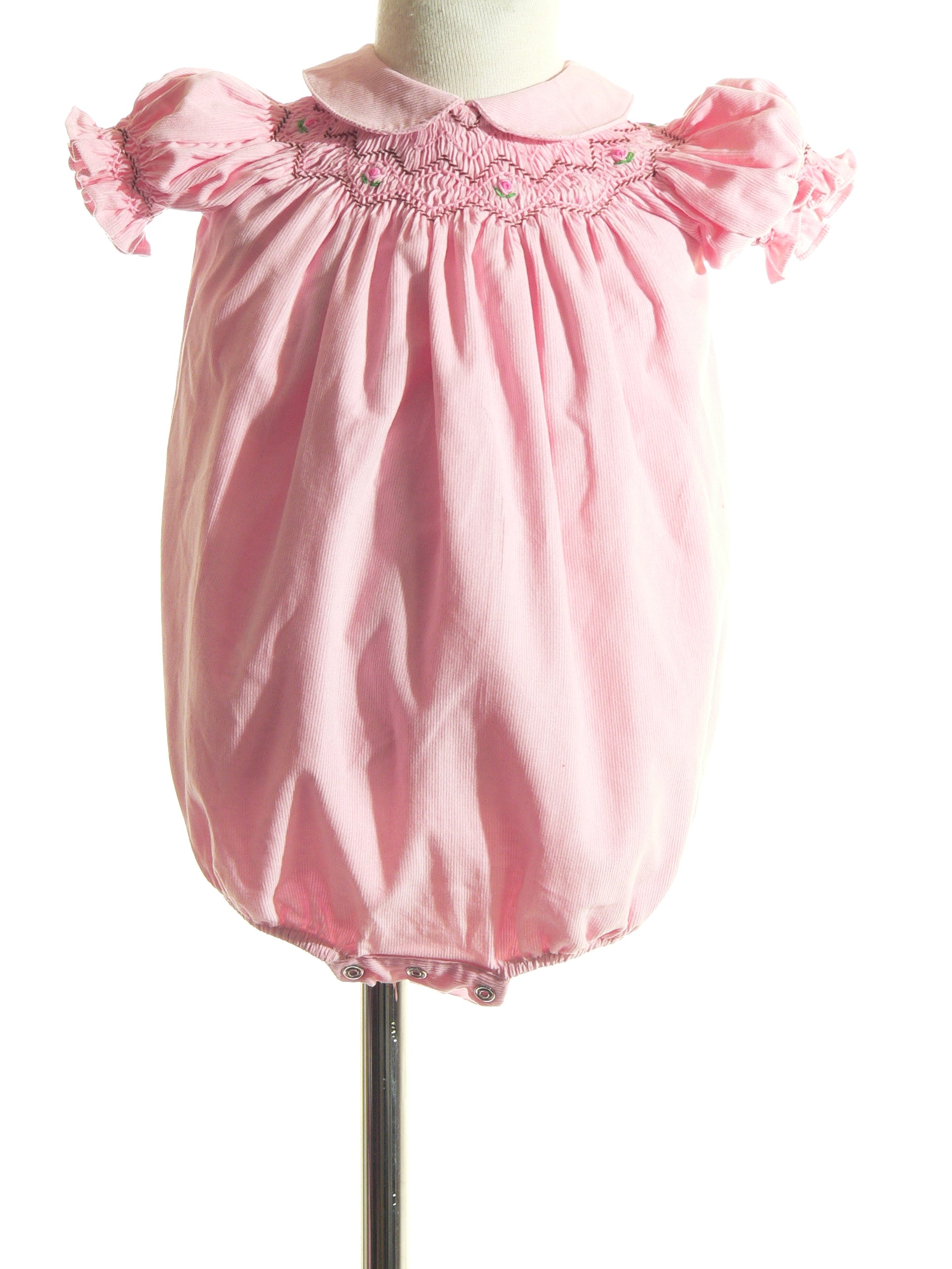 Dress your little one in charming style with this Pink Corduroy Geo Smocked Bubble. Featuring delicate rose embroidery and playful geometric smocking, its soft corduroy fabric offers cozy comfort. The short bishop sleeves add a whimsical touch, perfect for twirling and sunny day adventures. A delightful blend of sweet details and comfy design to brighten any occasion!