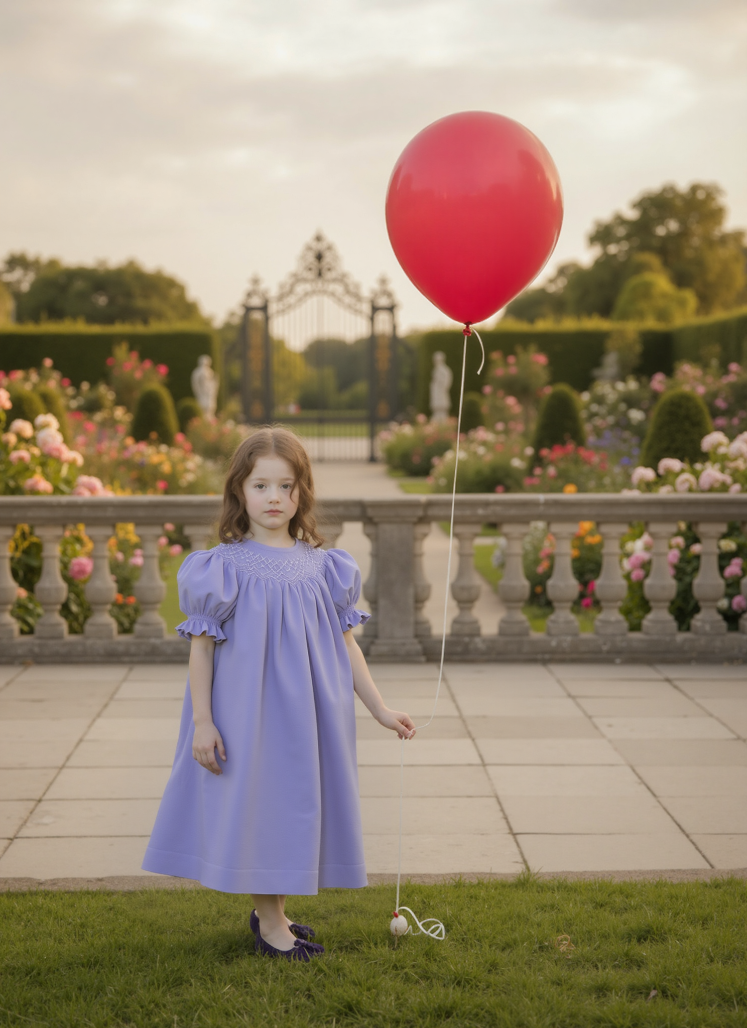 This charming purple corduroy dress features delicate geometric smocking details adorned with pearl accents that add a touch of elegance. The Short puffed bishop sleeves create a sweet, classic silhouette perfect for special occasions or everyday wear. Crafted from soft corduroy fabric, it offers comfort and durability while the thoughtful design details make it a standout piece in any little one's wardrobe. An ideal choice for parents seeking quality and style combined.